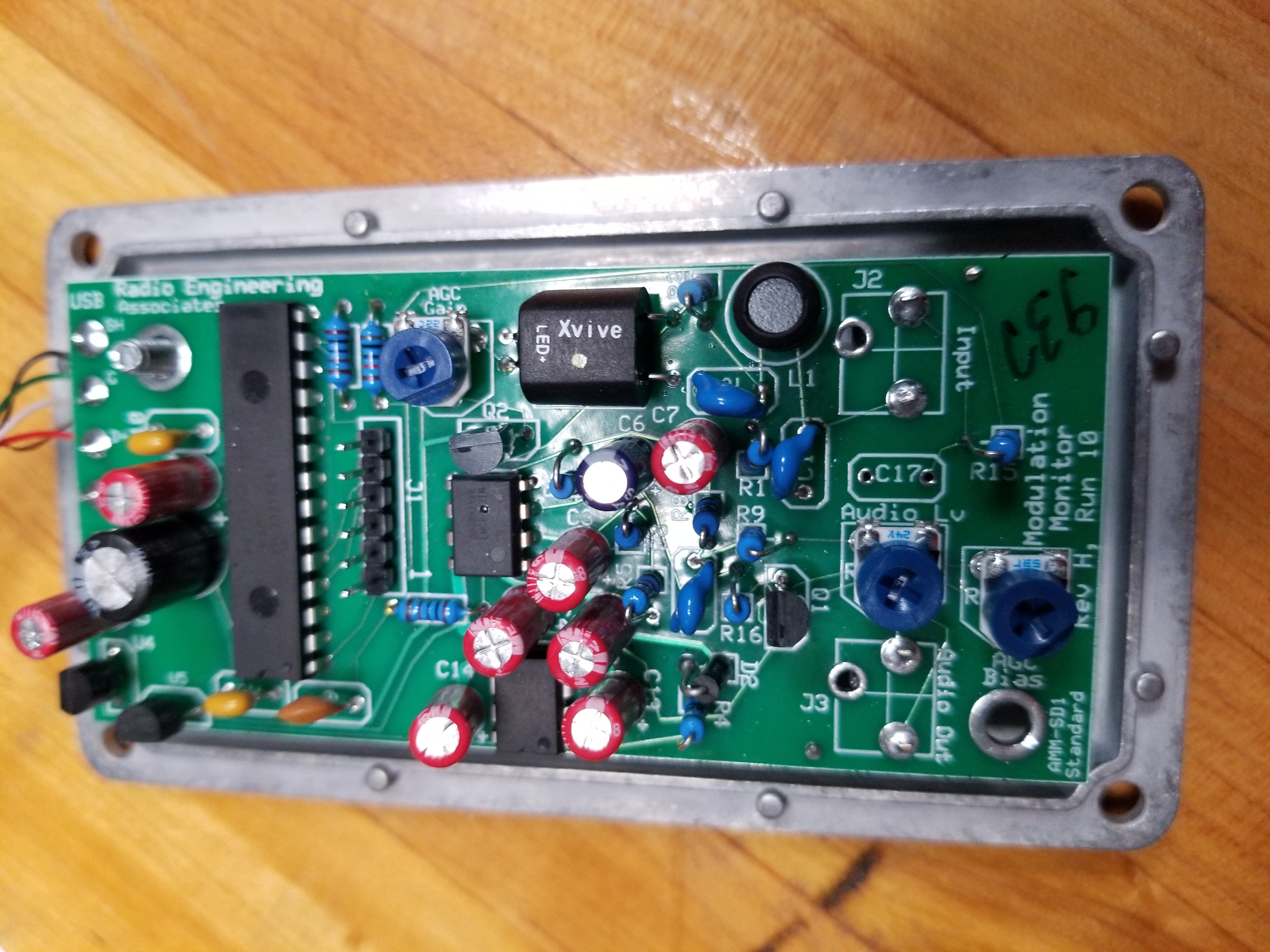 Video showing the AMM-SD1 in operation. Note the negative peaks are higher than the positive peaks indicating weak tubes in my Dentron Clipperton L amplifier. The image in the background is the waterfall graph from the KFS Web SDR. ![]() Inside the envelope detector module. The output is a DC voltage containing the carrier level plus AC representing the modulation. ![]() The USB interface. This module accepts the output of the envelope detector and sends it as a stream over USB for interpretation by the Windows software. This module uses a PIC24 microcontroller. ![]() For comparison, there's a photograph of a General Radio 1931A modulation monitor. |