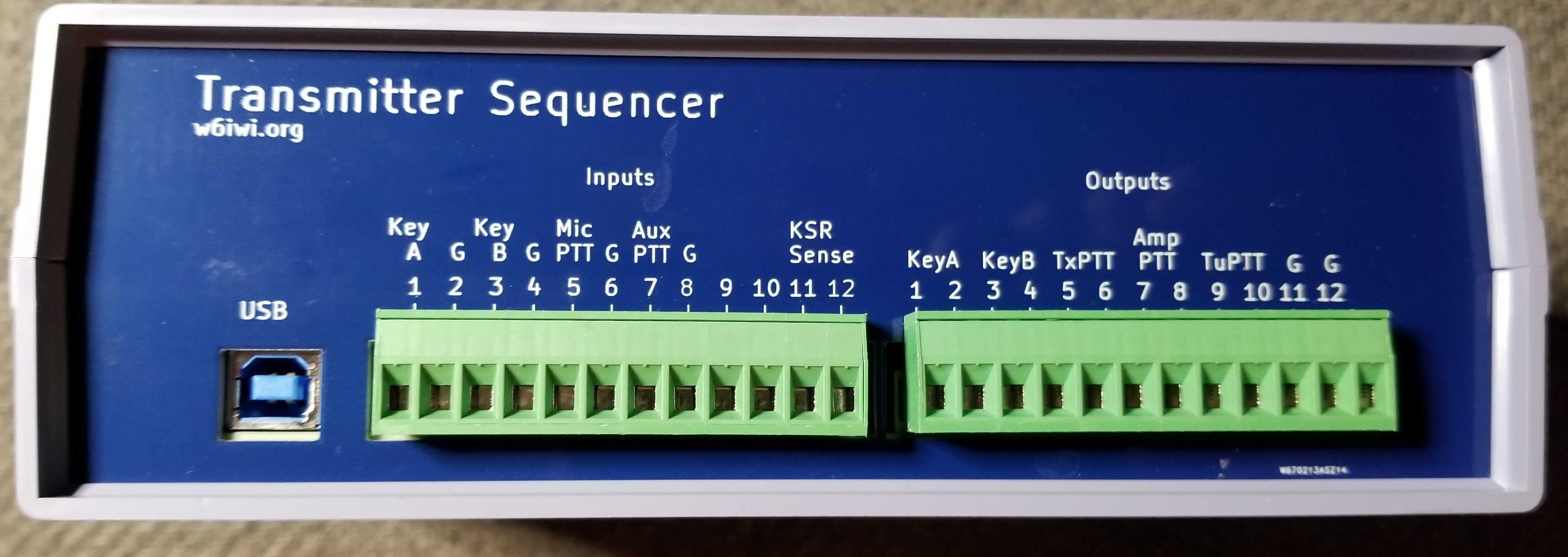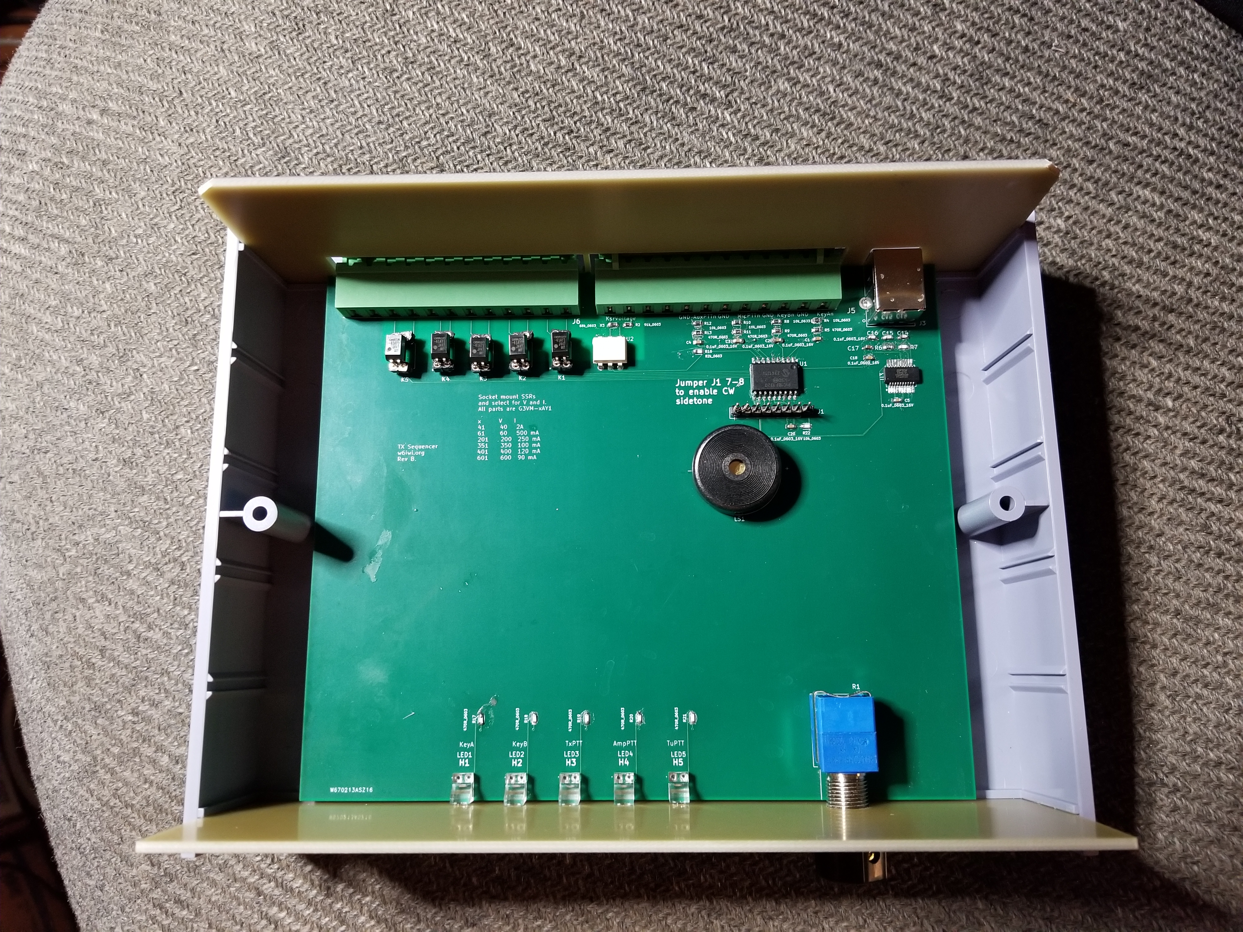 This page will be updated as the project progresses. The current schematic is here. The project is designed to prevent hot switching of the RF bypass relay in an RF amplifier. It does this by putting the amplifier in transmit mode (activating the relay) as soon as a transmit request is received (on one of the key or PTT lines). After a user configurable delay (default 100 ms), the PTT or key signal is passed through to the transmitter. In addition, there is a user settable Key Operated Send dropout time. A front panel pot lets the user set the release time of the amplifier keying output to zero to 10 seconds after the key or PTT line is released. For example, as demonstrated in the video at the right, hitting the KeyB input immediately activates the amplifer enable output. 100 ms later, the KeyB output is enabled. When the KeyB input is released, the KeyB output is immediately released, but the amplifier enable output is not released. The amplifier stays in the transmit mode until the KOS timeout (I generally set it to 3 seconds) times out (such as 3 seconds after the KeyB input is released). KeyA behaves the same as KeyB. These two inputs and outputs typically pass a CW paddle signal through to the transmitter. If a straight key or bug is used, the KeyA and KeyB inputs can be tied together with the KeyA output driving one transmitter and the KeyB output driving another transmitter. There are two additional keying inputs: MicPTT and AuxPTT. These operate similarly to the KeyA and KeyB inputs except that on release, the amplifier transmit enable is released immediately. The amplifier PTT is released after the user confiugrable delay, the same delay that was used on transmit start, with the default being 100 ms. Finally, there is an RTTY Keyboard Operated Send input. This is wired ACROSS the Teletype. When a key on the Teletype is pressed, the start bit plus any space bits in the character result in a high voltage across the Teletype (the full loop supply voltage, which is typically 50 to 100 volts). This trips the KOS functionality of the device, causing the amplifier to be switched to transmit, then, after a delay, the transmitter PTT is enabled. However, during receive, a mark to space transition results in high voltage across the Teletype due to the selector magnet flyback voltage. However, this high voltage pulse is very short compared to a bit time (22 ms for 45.45 baud or 60 wpm). The firmware ignores any high voltage pulses shorter than 11 ms (half a bit time). HardwareRefer to the schematic.